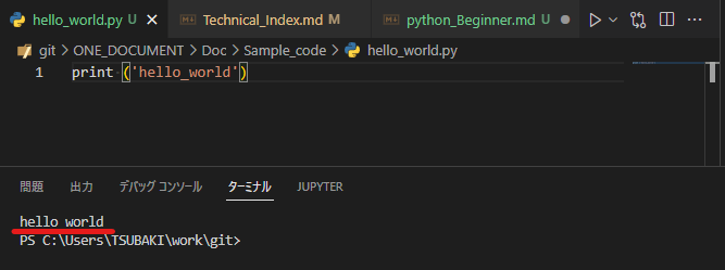 まずは任意のディレクトリーにpy拡張子のファイルを作成してhello_worldと表示されるModuleを作成してみる。 printメゾットはコンソールに値を出力することができるメゾット